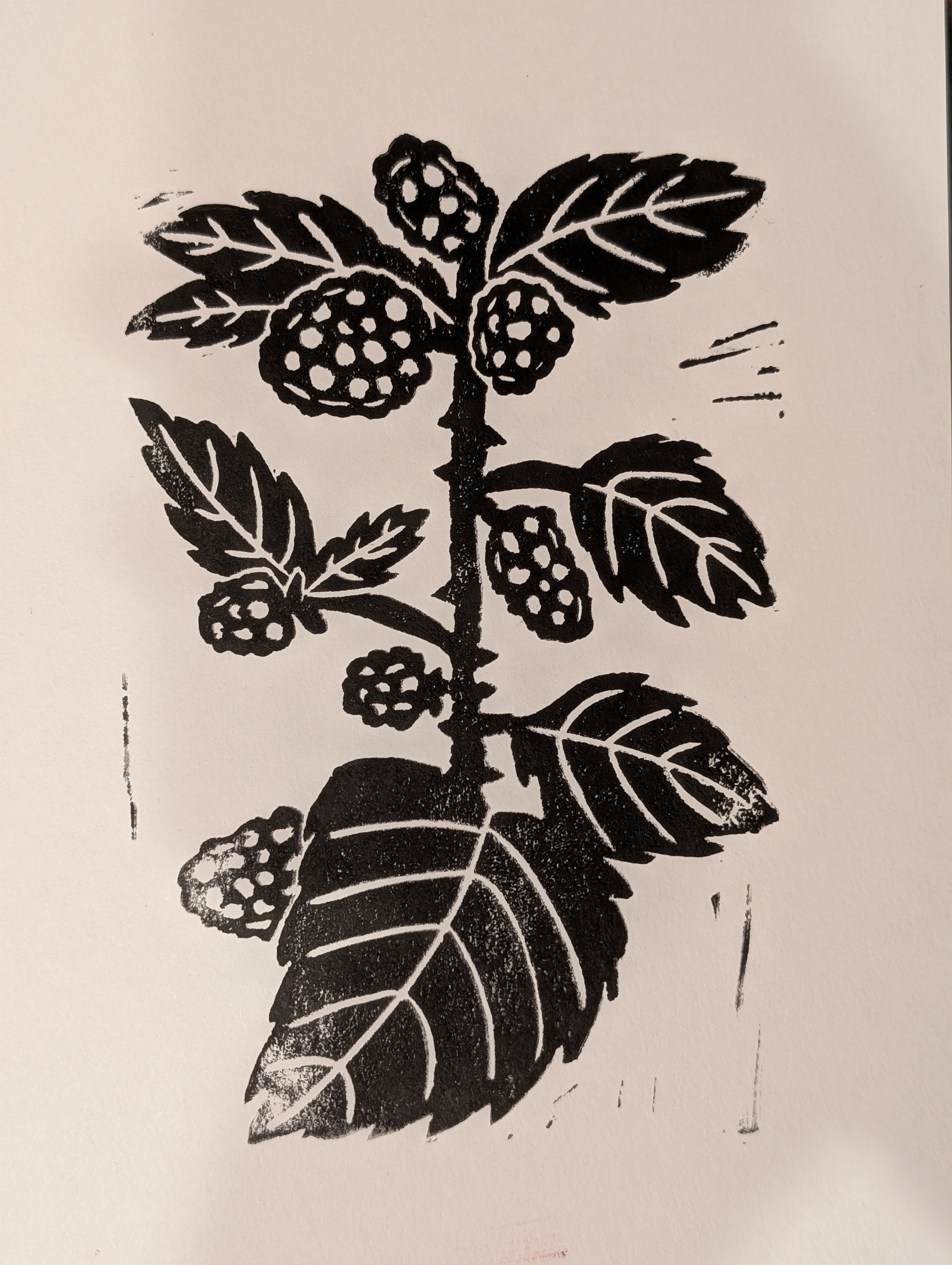 Every Summer one of our printmakers has a tradition of going out to their families camping grounds. Their camping grounds are densely populated with raspberry and blackberry bushes. Drawing inspiration from these bushes, our printmaker made one of the bushes berries, leaves and stem.